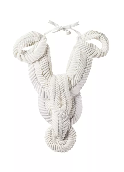 Artist and designer Grace Lillian Lee uses fashion and accessories to represent her diverse cultural heritage. Her mother is of German, Danish and English descent, while her father was born on Thursday Island to a Chinese father (a pearl diver) and a Torres Strait Islander mother. Lee uses fashion and adornment to represent her diverse cultural heritage, whilst being inspired by the beauty of the ocean and the Great Barrier Reef. Lee has become known for her wearable interpretations of Torres Strait Island weaving techniques, known as prawn-weaving. Swapping the traditional palm leaf for pre-dyed cotton webbing, Lee pushes the boundaries of traditional techniques to create layered woven body sculptures and accessories. By bringing such techniques into the contexts of both art and fashion Lee has engaged a wide audience allowing her to develop a successful business based on woven accessories, celebrating and exploring her lineage.