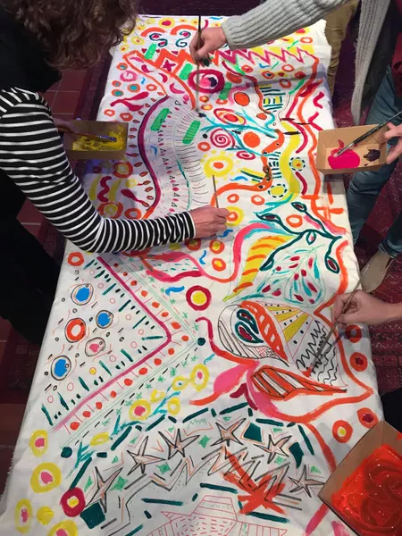 Working in collaboration with other artists was a major theme of this workshop. Ngarrindjeri artist Thomas Readett gave insight into the design process when working with fellow artists Mankitya Cook and Elizabeth Close. Earlier in the year, Readett, Close and Cook completed a mural for the Adelaide City Council in honour of South Australian reggae band No Fixed Address. Readett discussed the challenges of working on such a large scale in a small space and uniting three artists' styles into one cohesive piece. Teachers were provided with a brief to design a lane way mural for AGSA that references art history and would lead visitors to the northern entrance.