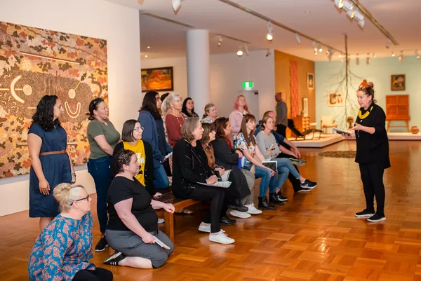 These sessions provide a best-practice model for educators, demonstrating how to respond to works of art while recognising the diversity of Aboriginal and Torres Strait Islander artists. Through discussion and practical application, educators develop cultural understanding, challenge their preconceptions, and make connections to their students’ histories and cultures.