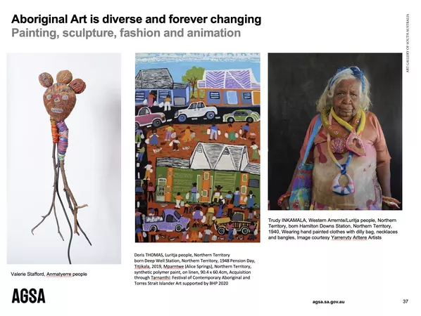 Aboriginal and Torres Strait Islander Art in the Classroom is a professional development offering for educators, which has been developed and run independently by AGSA. The program is, however, presented in collaboration with individual Aboriginal and Torres Strait Islander artists, as their voice is critical to the pedagogic aims of the program.