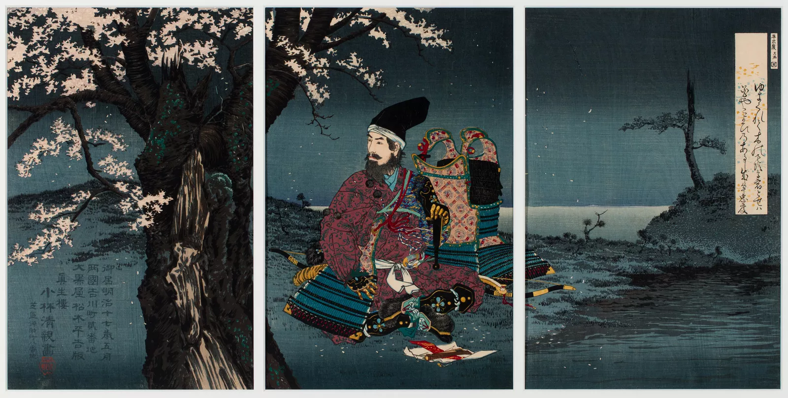 Kobayashi Kiyochika, born Edo (Tokyo) 1847, died Tokyo 1915, Taira no Tadanori (1144–1184) resting under a cherry tree, 1884, Tokyo, woodblock print, ink and colour on paper, triptych, 36.5 x 25.5 cm (each sheet); d'Auvergne Boxall Bequest Fund 2013, Art Gallery of South Australia, Adelaide, photo: Stewart Adams.
