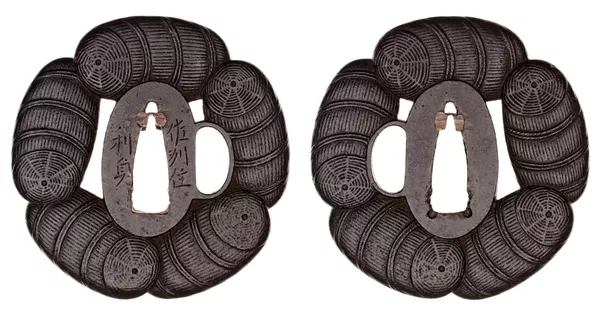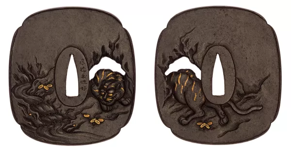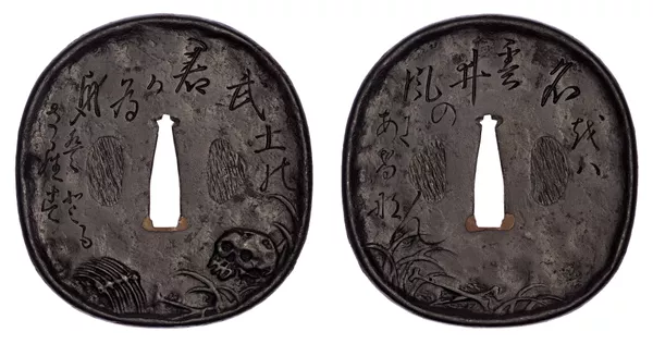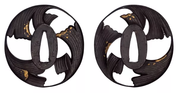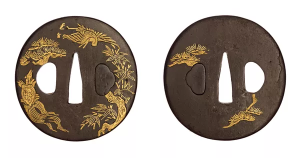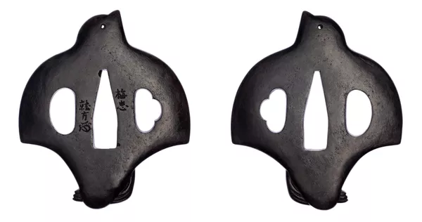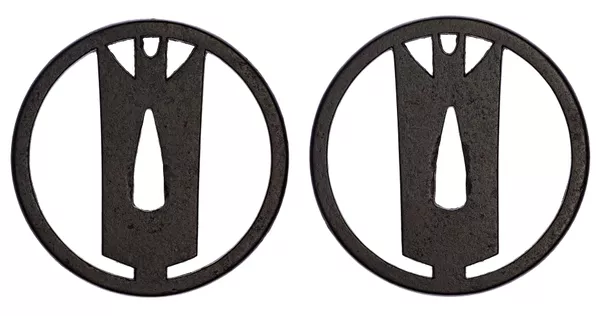A Tsuba is a guard which it positioned at the end of the grip of a sword. Tsubas protect the hand and help to balance the weapon on the body. During the Edo Period (a peaceful time in Japan) the tsbua was more ornamental than it was functional. These tsubas are highly decorative and were made from softer, precious metals such as gold. Tsbuas are considered heirlooms and families with samurai roots will have their family crest incorporated into the design.