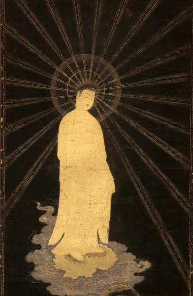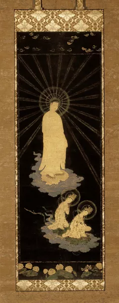 The hanging scroll depicts Amida Buddha as he descends from his Western Paradise to a devotee on their deathbed. It was believed that at the moment of death if one uttered the Japanese words ‘namu amida butsu’ three times, which means 'I take refuge in Amida Buddha', the devotee would be transported to the Pure land of bliss. These scrolls were often used for personal devotion and meditation on Amida and the Pure Land.