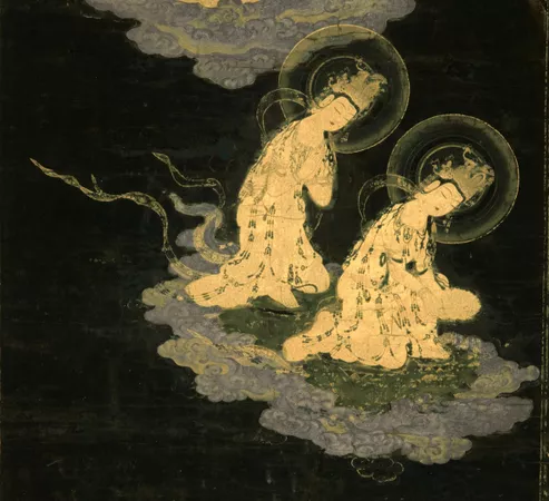 Descent of the Amida trinity and Fudõ Myõõ, were created at approximately the same time and depict very different aspects of Buddhism as understood in Japan. The 14th and 15th centuries were a period unrest in Japan due to the attempted invasions of the Mongol empire and widespread belief that Buddhism was in decline. Devotees sought more direct practices to attain enlightenment and ultimately nirvana (the end of suffering), after which one is not reborn on to the wheel of suffering (samsara) or life.