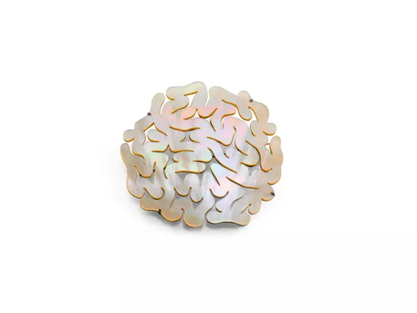 To make his Brain brooch Freeman has carved a vermicular, or worm- like, pattern into the pearl shell to make a wearable object. The pattern resembles the human brain but also the species of coral known as Brain coral. By choosing to work with this material in this way Freeman uses one marine species to suggest another with both organisms found in abundance in the Pacific Ocean.