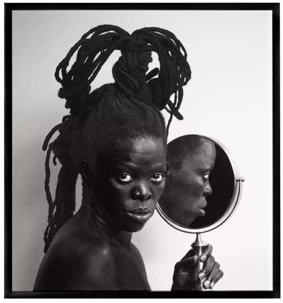 Zazi is a black and white self-portrait, the artist is look over their right shoulder, with a commanding and watchful gaze, holding a mirror in their left hand so that the profile of the artist is visible in the reflection. Zaziwas shot when the artist was in Boston, but printed in Durban, where the artist lives and works. Zazi – in isiZulu, the artist’s mother tongue means ‘to know oneself’ – in Swahili it means ‘wise’, and in Nigerian, ‘mirror of beauty’. For the artist, to know oneself is about self-representation - to see oneself and to be seen, to be reflected in the world, to be visible.