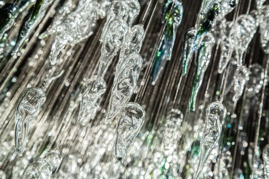 Thunder Raining Poison consists of over two thousand hand-blown streaky green glass yams, taking on the form of an atomic cloud this work addresses a history of British Nuclear testing during the 1950s and 60s in Maralinga.