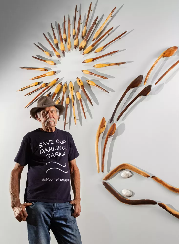 Badger Bates is a Barkandji Elder who was born in Wilcannia, NSW, in 1947. As a child he travelled up and down the Barka (Darling River) with his grandmother. ‘Granny Moysey’ taught Bates about his Barkandji culture and showed him how to carve.