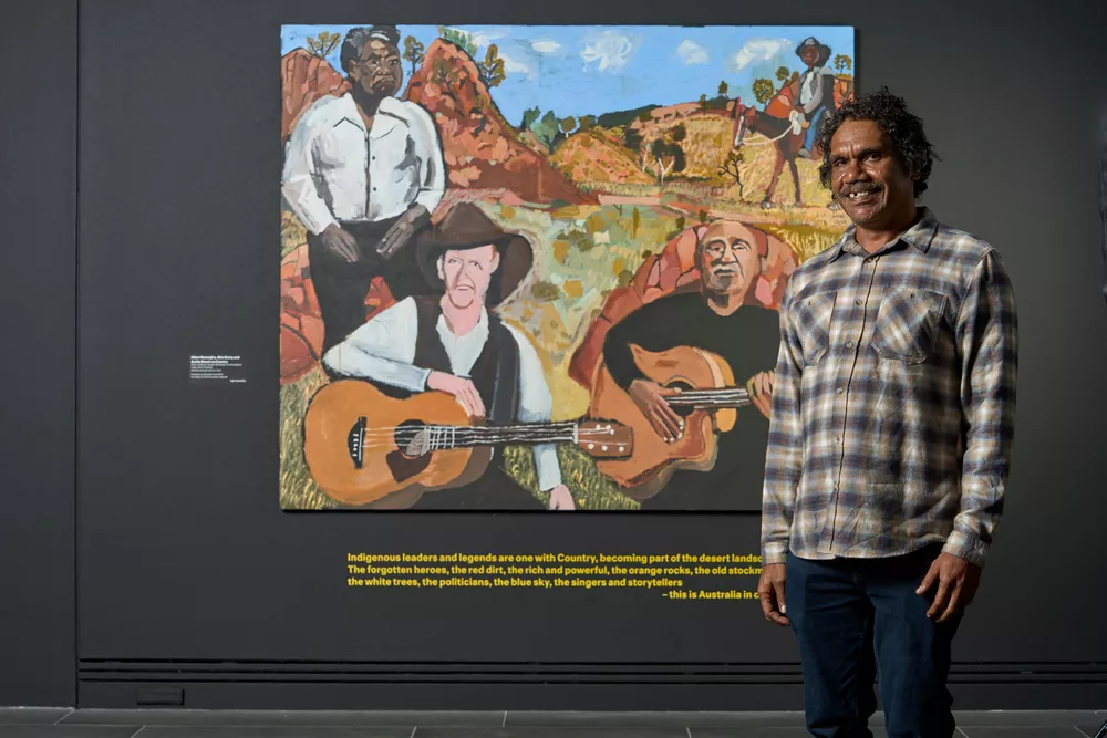 Vincent Namatjira with his work Albert Namatjira, Slim Dusty and Archie Roach on Country, Vincent Namatjira: Australia in colour, Tarnanthi 2023, Art Gallery of South Australia, Adelaide; photo: Sam Roberts.