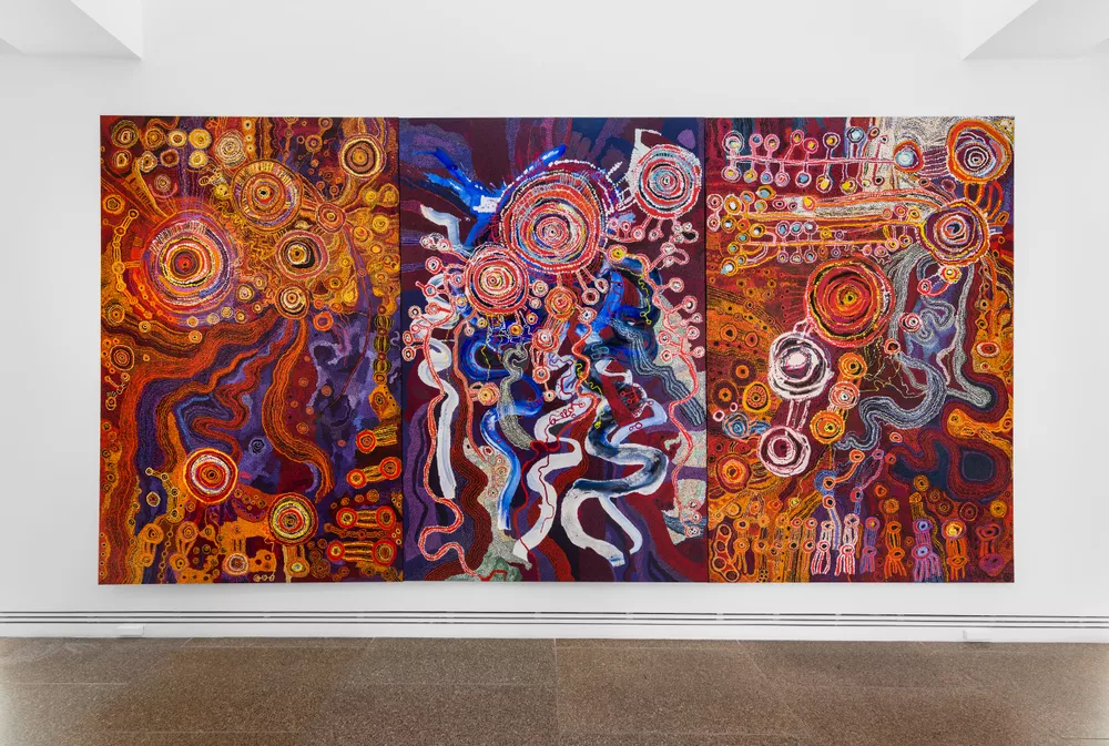 In the contemporary Western Desert art tradition, painting is frequently pursued collaboratively, with canvasses laid laterally on the ground in the direction of country. The Ken sisters – Tingila Yaritji Young, Maringka Tunkin, Sandra Ken, Freda Brady and Tjungkara Ken – are part of this desert art tradition, a distinct lineage formed initially by women, under the name of Minymaku Arts (meaning ‘belonging to women’), just twenty years ago in Amata in the Anangu Pitjantjatjara Yankunytjatjara (APY) Lands.