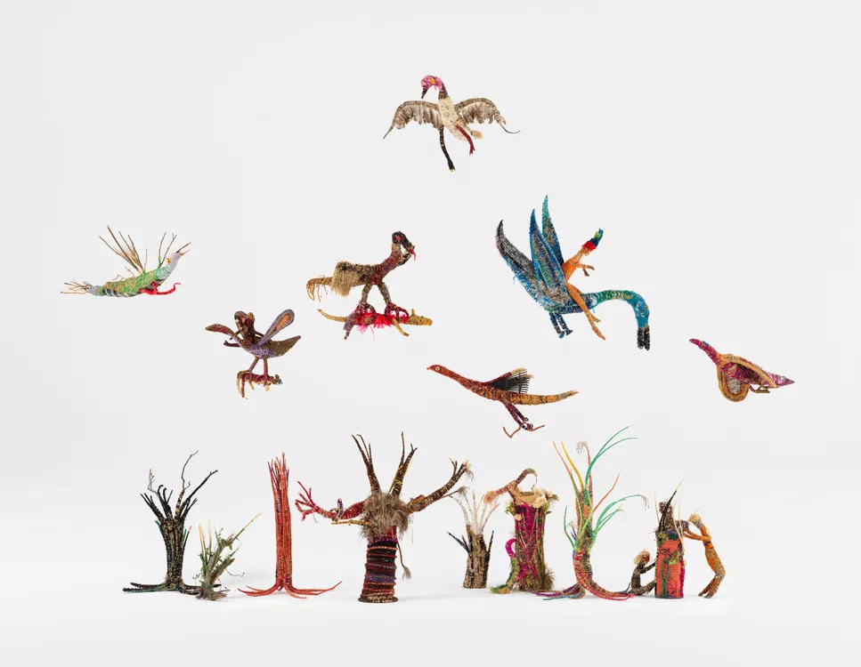 Kunmanara (Mary) Katatjuku Pan, Pitjantjatjara people, South Australia, born Rocket Bore, Aṉangu Pitjantjatjara Yankunytjatjara Lands, South Australia c.1944, died Mparntwe (Alice Springs), Northern Territory 2025, Iluwanti Ken, Pitjantjatjara people, South Australia, born Watarru, Aṉangu Pitjantjatjara Yankunytjatjara Lands, South Australia c.1944, Naomi Kantjuriny, Pitjantjatjara people, South Australia, born Victory Downs, South Australia 28 September 1944, Rene Kulitja, Pitjantjatjara people, South Australia, born Pukatja (Ernabella), Aṉangu Pitjantjatjara Yankunytjatjara Lands, South Australia 1958, Kunmanara (Nyurpaya) Kaika Burton, Pitjantjatjara people, South Australia, born Atila (Mount Conner),Northern Territory 1949, died Mparntwe (Alice Springs), Northern Territory 2023, Kunmanara (Paniny) Mick, Pitjantjatjara people, South Australia, born Rocket Bore, Aṉangu Pitjantjatjara Yankunytjatjara Lands, South Australia 1939, died Mparntwe (Alice Springs), Northern Territory 2022, Yaritji Tingila Young, Pitjantjatjara people, South Australia, born Pukatja (Ernabella), Aṉangu Pitjantjatjara Yankunytjatjara Lands, South Australia 1956, Tjanpi punu (trees), 2012, near Amata, Aṉangu Pitjantjatjara Yankunytjatjara Lands, South Australia, Tjanpi (native desert grasses), acacia branches, chicken wire, acrylic wool, unspun sheep's wool, wipiya (emu feathers), raffia, paper raffia, plastic flowers and leaves, gumnuts, pillow stuffing, mulga stumps, wire, synthetic polymer paint, second hand clothing; Gift of Margaret Bennett, Vivienne Bolaffi, Elizabeth Finnegan OAM, Lipman Karas, Shane Le Plastrier, Sue Tweddell and Ann Vanstone through the Art Gallery of South Australia Collectors Club 2012, Art Gallery of South Australia, Adelaide, © the artist, Tjanpi Desert Weavers, NPY Women's Council, photo: Grant Hancock.
