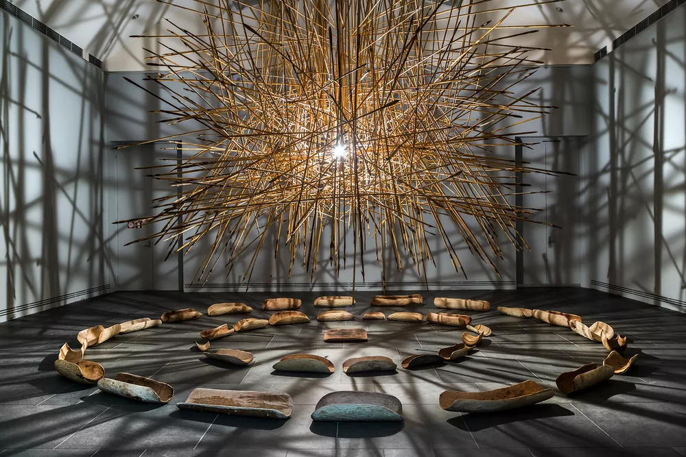 Kulata Tjuta, meaning ‘many spears’, is an ongoing project of cultural maintenance, which began in the Amata community in the Anangu Pitjantjatjara Yankunytjatjara (APY) Lands. The installation is made up of 550 spears and takes on the appearance of an explosion frozen in time. This references the atomic bomb testing carried out at Emu Junction and Maralinga between 1953 and 1963 and the resulting ‘black mist’, which caused illness and death for many Anangu (people).