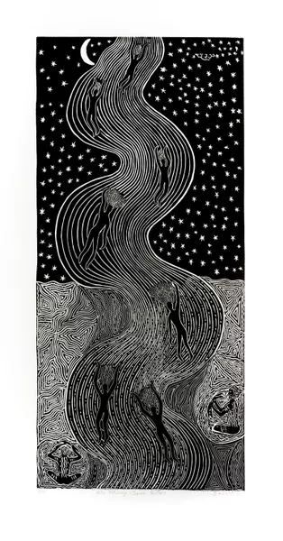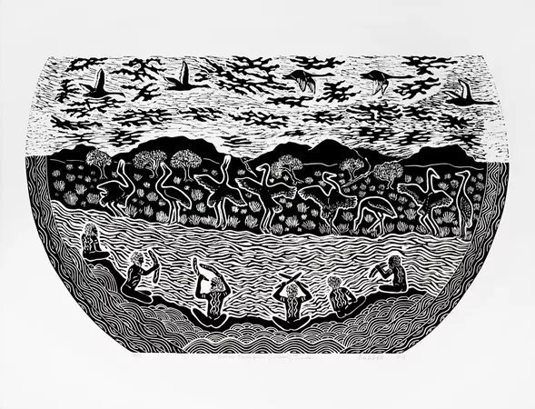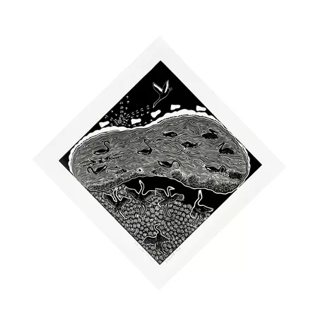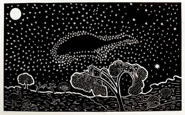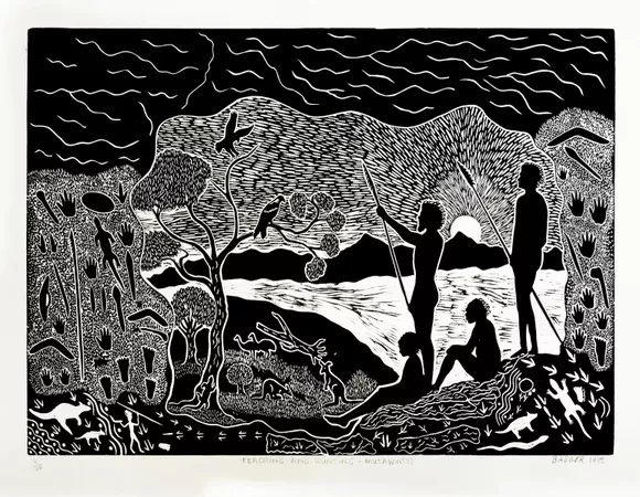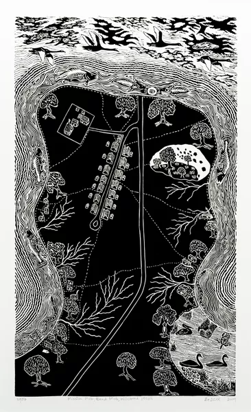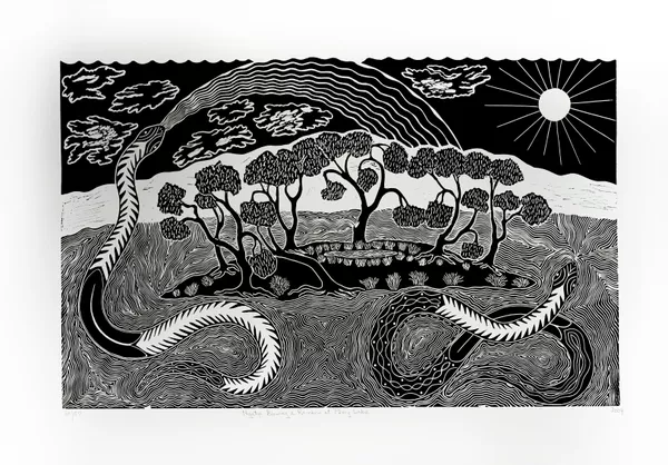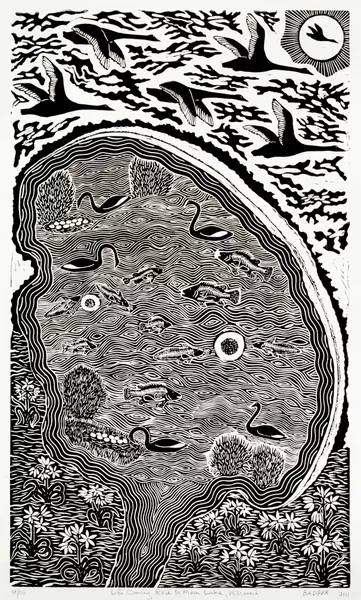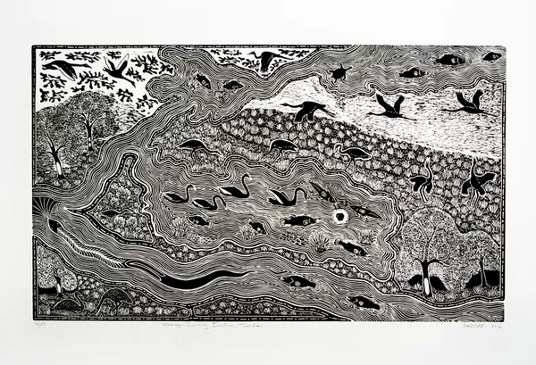 Bates often works within the media of linocut printing, wood, emu egg and stone carving and metalwork. His lino prints show his connection to Country and the interconnected ecosystems of the Barka.