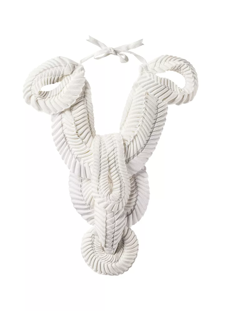 Intertwined is an intricate example of ‘prawn weaving’. The tightly folded basketry technique is traditionally executed in pandanus, palm leaf or banana leaves, a practice that travelled to the Torres Strait from Papua New Guinea as part of the late-nineteenth century pearling industry. Lee has translated its neat folds into dyed cotton webbing. Having learnt the technique from senior Erub artist Uncle Ken Thaiday, celebrated for his ceremonial headdresses, Lee has drawn on the performative and ceremonial traditions of the Torres Strait to produce an innovative form of body adornment.