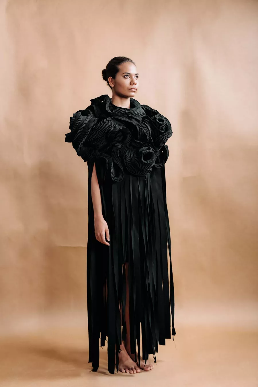 Grace Lillian Lee, Meriam Mir people, Erub (Darnley) Island, Torres Strait Islands, Queensland, born Cairns, Queensland 1988, Future Woven Floral Forms (black) 3, 2020, Cairns, Queensland, canvas, cotton webbing, (dimensions variable); June Porter Fashion Fund 2023, Art Gallery of South Australia, Adelaide, © the artist