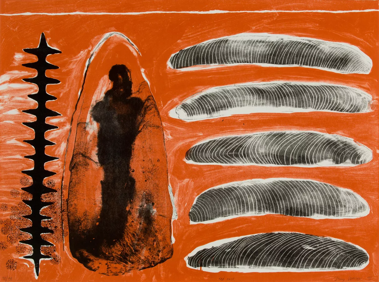 Judy Watson, Waanyi people, Queensland, born Mundubbera, Queensland 1959, red rock, from the portfolio Crossroads: Millennium Portfolio of Australian Aboriginal Artists, 1998, printed by Fred Genis, published 1999 by 21C, Sydney, colour lithograph on paper, 56.0 x 76.2 cm (image), 57.2 x 76.2 cm (sheet); Gift of Leo Christie through the Art Gallery of South Australia Foundation 2015. Donated through the Australian Government's Cultural Gifts Program, Art Gallery of South Australia, Adelaide, © Judy Watson/Copyright Agency, photo: Stewart Adams.