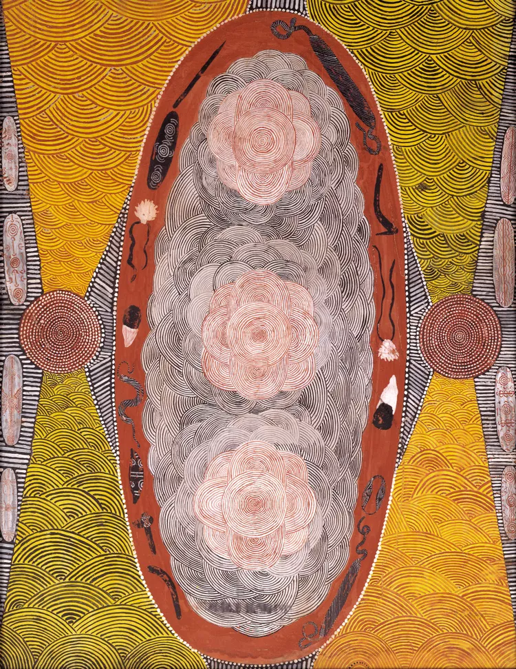In 1982, Women Dreaming became the first Western Desert painting by a woman artist to be acquired by an art museum. The distinctive circular work had been painted earlier that year by Anmatyerre artist Daisy Leura Nakamarra. It depicts the important site of Illpilli, 150 kilometres west of Papunya, where a group of women once camped in search of edible berries and witchetty grubs. Dots and lines in ochre, yellow and brown tones fill Nakamarra’s geometrical work. Depicted as crescent forms are the seated women who tilled the earth with digging sticks, which Nakamarra renders as straight lines. Centred among the women are their oval-shaped bowls and surrounding them are the footsteps showing their journey across the varying terrains of red sandhills and yellow spinifex grasses.