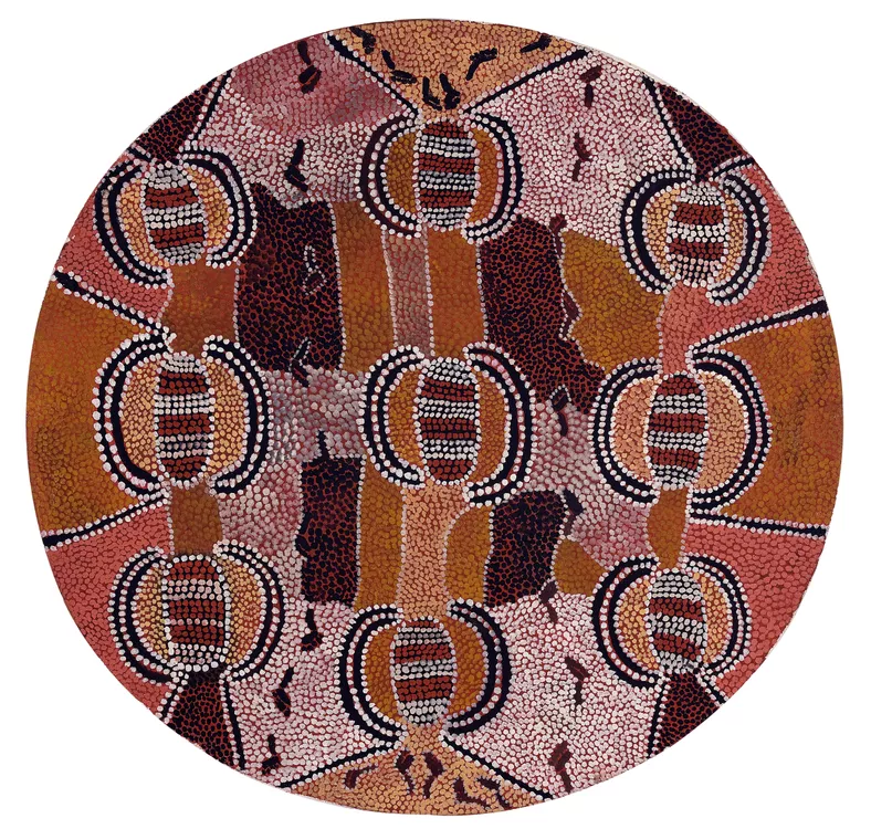Daisy Leura Nakamarra, Anmatyerre people, Northern Territory, born Umbungurru Creek, Northern Territory c.1938, Women Dreaming, 1982, Papunya, Northern Territory, synthetic polymer paint on canvas, 59.0 cm (diam.); Lisette Kohlhagen Bequest Fund 1982, Art Gallery of South Australia, Adelaide, © Daisy Leura Nakamarra/Aboriginal Artists Agency.