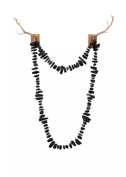 Malahide is large-scale sculpture by Julie Gough and is made from 108 pieces of coal, strung together over found antlers. The work takes its name from a colonial property, Malahide, in Fingal, Tasmania, a place that, like the sculpture’s materials, has born witness to Australia’s early contact history.