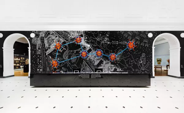 Kaylene Whiskey, Yankunytjatjara people, South Australia, born Mparntwe (Alice Springs), Northern Territory 1976, Seven Sistas Sign, 2021, Indulkana, Anangu Pitjantjatjara Yankunytjatjara Lands, South Australia, water-based enamel paint on metal, 75.0 x 270.0 x 3.0 cm; Acquisition through Tarnanthi: Festival of Contemporary Aboriginal & Torres Strait Islander Art supported by BHP 2022, Courtesy the artist and Iwantja Arts, © Kaylene Whiskey