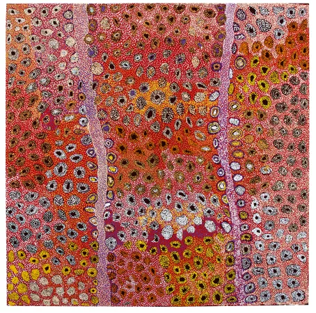 For Burton, painting, as well as singing whilst painting, is key to the transmission of Tjukurpa. It maintains the strength of Aṉangu culture and knowledge. With a bold, brilliant palette and overwhelming scale – the canvas spans nearly three by three metres – Kungkarangkalpa – Seven Sisters isnot just a powerful creation story performed and passed down for thousands of generations, but also a morality tale for today. Burton’s own role as a senior woman and cultural leader is reflected in her transcription of Kungkarangkalpainto paint:
