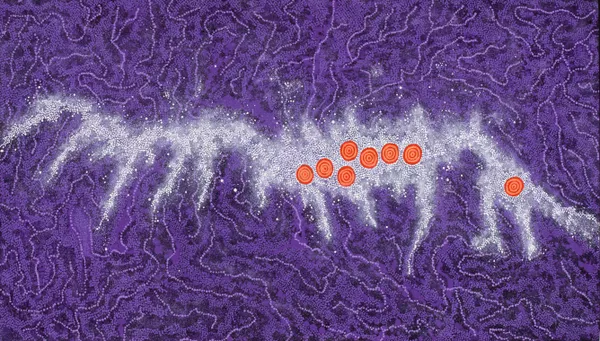In Kungkarangkalpa – Seven Sisters (2020) Burton paints the ancestral story of the Seven Sisters, a significant Tjukurpathat describes the intergenerational strength of Aṉangu women learning from and protecting one another. Based on two star constellations, the Seven Sisters (Pleiades) are chased by a trickster (Orion) across the land and into the night sky. It is the knowledge and wisdom of the eldest sister that stewards the sisters to safety: