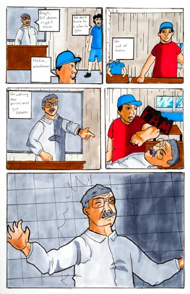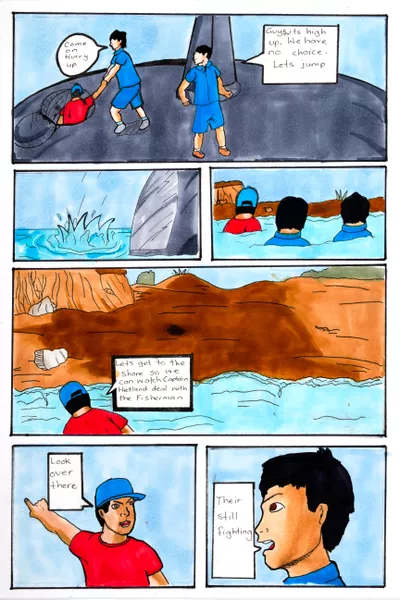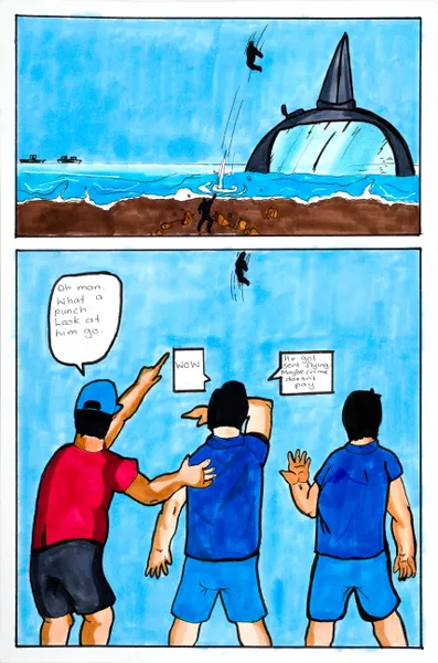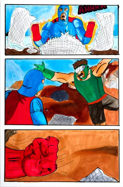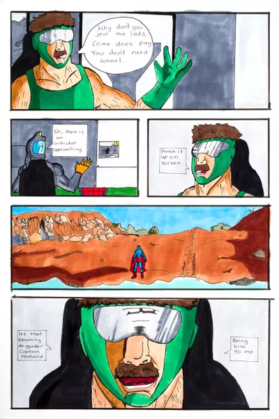 Captain Headland versus The Fisherman is a comic book by Layne Dhu-Dickie who was born in 2004 in South Headland in the Pilbara region of Western Australia. Dhu-Dickie’s heritage lies with the Banjiyma people. His one-off characters share moral codes and life unique to the Pilbara. When he was aged seven, he began drawing characters such as Sonic the Hedgehog and would spend time reading his Dad’s comics. Both Mudjandi and Dhu-Dickie are young artists who draw inspiration from superheroes and comic book characters. Compare the work by both artists. How are their works similar and how are they different?