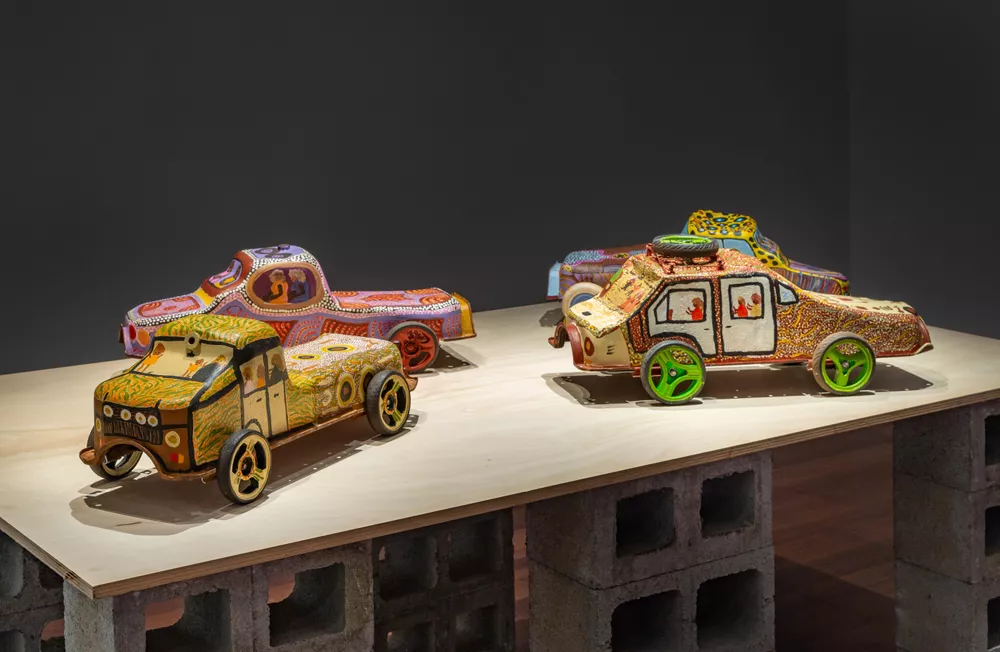 In 2017, artists from Irrunytju started collecting found objects to be used for their art making. Look closely at each mutaka (motor car). What recycled objects can you recognise?