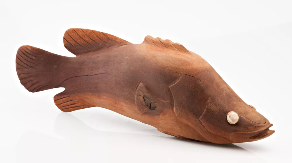 Unknown, Barramundi, c.1991, near Broome, Western Australia, wood & shell, 15.0 x 49.0 x 8.5 cm; Public Donations Fund 1992, Art Gallery of South Australia, Adelaide.
