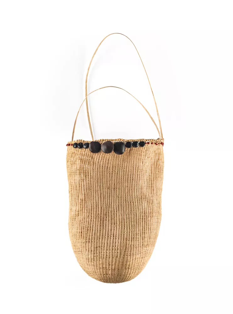 Delissa Ngadijina Walker, Kuku Yalanji people, Queensland, born Cairns, Queensland 1990, Kakan (baby carrier), 2017, Cairns and Daintree, Queensland, black palm (Normanbya normanbyi), lawyer cane, black burny bean seeds (Mucuna gigantea) and red sandalwood seeds, 97.5 x 41.5 x 25.5 cm (irreg.); Acquisition through Tarnanthi: Festival of Contemporary Aboriginal and Torres Strait Islander Art supported by BHP 2019 Art Gallery of South Australia, Adelaide © Delissa Ngadijina Walker photo: Saul Steed