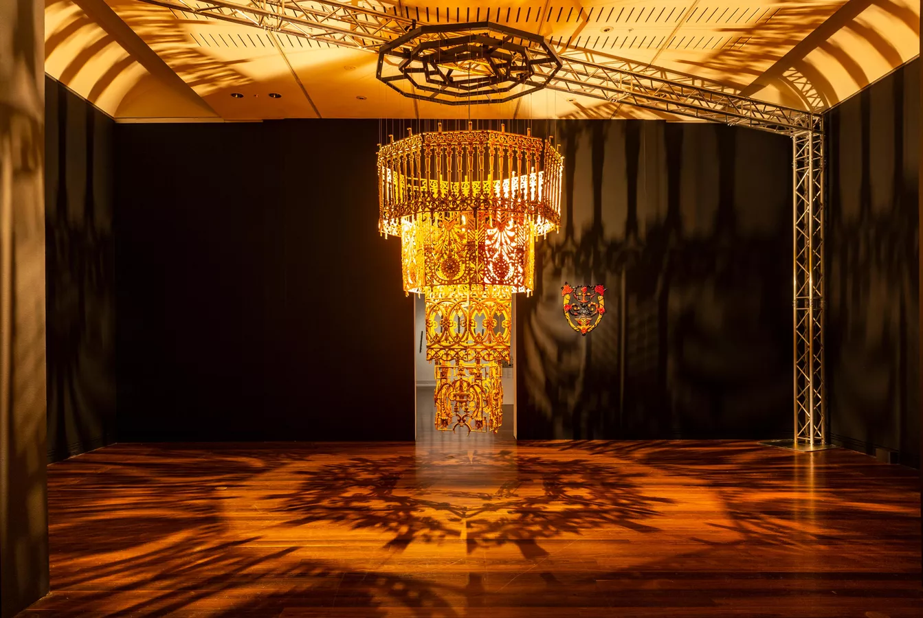 installation view: 2022 Adelaide Biennial of Australian Art: Free/State, featuring Casting shadows [Chandelier] and The Settlement [Shield] by Dennis Golding, Art Gallery of South Australia, Adelaide; photo: Saul Steed.