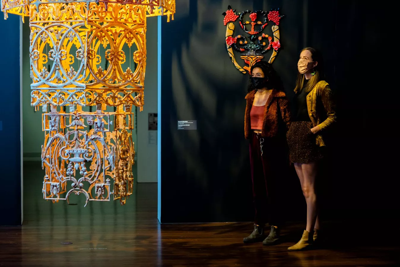 Casting Shadows (chandelier) references Golding’s childhood memories of growing up in inner Sydney, Redfern. Golding has recreated fragments of the Victorian-style wrought iron fences that adorn these terraced houses. Dismantling the wrought iron panel, Golding recasts it in resin and reconfigures them to present it as a shield, which he is in control of – thus decolonising the original lacework.