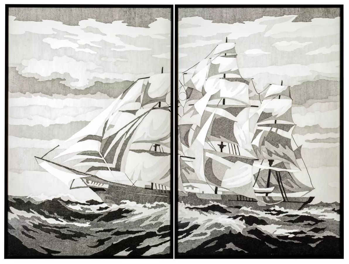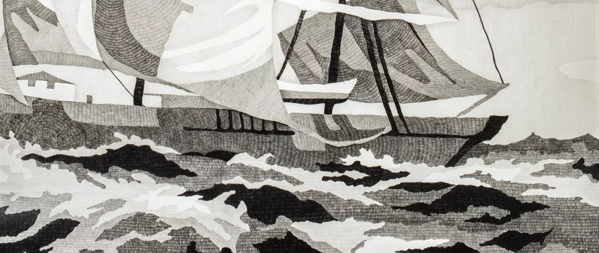 Nigh Night (2013) is a large-scale pencil drawing executed in two parts. A colonial sailing ship on the ocean is represented in McGregor’s celebrated and distinctive cross-hatching drawing technique, giving the work an embroidery-like quality. The varying tonalities of pencil marks delineate parts of the sail, sky and waves. This work is informed by McGregor’s relationship with phantasmal character ‘Water-face’ who was an imaginary friend during his childhood. McGregor named him this as he could not make out any distinguishing features – his face looked like moving water. ‘Water-face’ is a mediator between representation as both physical and psychological, and for McGregor the slippage between the unconscious and conscious informs the narrative of his work.