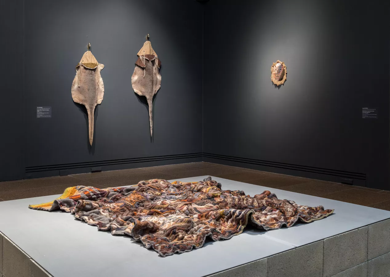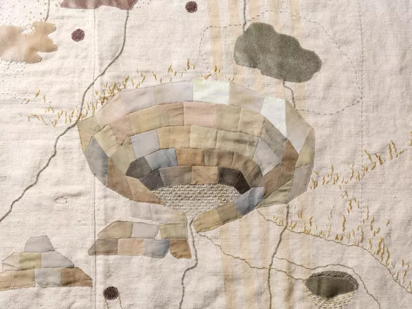 Waters often uses found or second-hand textiles to create her work. Over the past fifteen years, she has produced large sculptural installations to small intimate portraits using a wide range of materials, from op shop tea towels to her grandmother’s bedsheets, even using materials as unlikely as kangaroo skins. In repurposing used and vintage textiles, her practice emphasises “the marks and enrichment of age, wear and life… I’m trying to carry history along in the materials.” Her highly detailed and laborious hand-craft processes also draw attention to the medium of time; “the time I spend with every little piece of fabric and every stitch is to really think about the past and how it operates in the present.” [3]