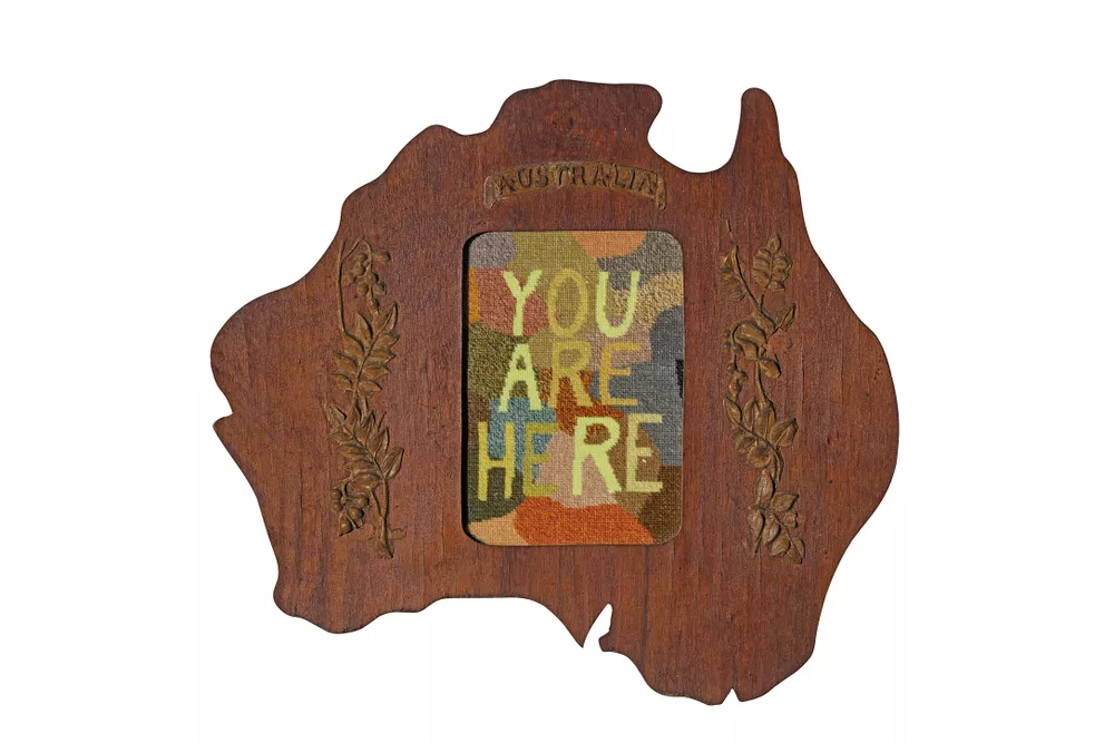 'My The Beginning, 2013–14, a petit point spelling out ‘YOU ARE HERE’, on top of an appropriated section of David Horton’s map of Aboriginal Australian language, social and nation groups, directly responds to Jubelin’s influential textile legacy. As well as petit point, both works repurpose specialised timber frames, prized homely devices for highlighting moments for remembrance. Such frames are popularly put around landscape scenes, but in these works of art the frames act to encourage the viewer to pause and ruminate upon how imposed lines and acts of claiming were layered atop Country, already deeply cared for and understood. The labour of every stitch, front to back and round again, goes beyond surfaces and transforms passing glances into moments for reckoning.' - Sera Waters, A Colonial Reckoning, Radical Textiles Catalogue, pg. 126, 2024