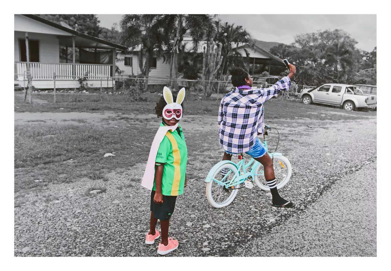 Naomi Hobson, Southern Kaantju/Umpila people, Queensland, born Coen, Queensland 1978, Road Play “She told Mum she was taking me for a ride down the road but she not.” Laine, from the series Adolescent Wonderland, 2019, Coen, Queensland, inkjet pigment print on paper, 81.0 x 110.0 cm; Acquisition through Tarnanthi: Festival of Contemporary Aboriginal & Torres Strait Islander Art supported by BHP 2019, Art Gallery of South Australia, Adelaide, © Naomi Hobson.