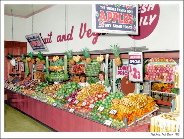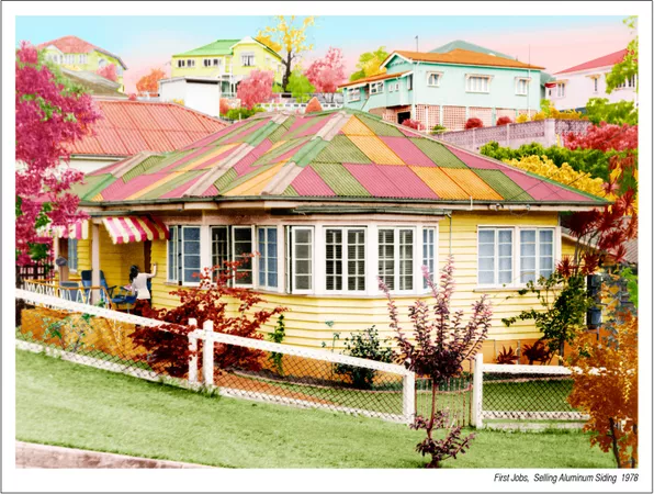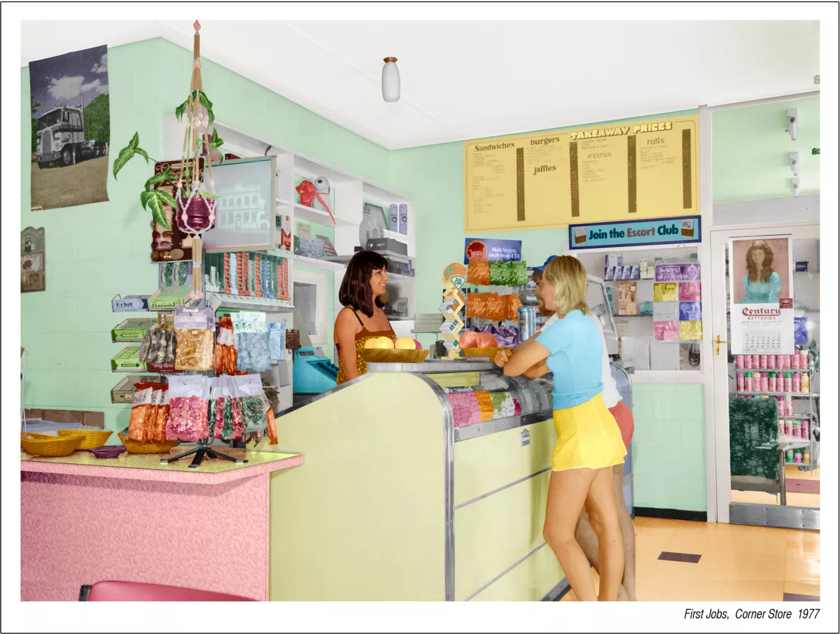 First Jobs, 2008, explores Moffatt’s own experiences of paid employment during her teenage years and early twenties. The autobiographical nature of the series is signalled by the titles of the twelve works, each of which identifies the job and year she was employed. Photoshopping herself into different workplaces, such as a fruit market and hair salon, she creates a nostalgic mood. This is reinforced by the bright colour palette of the inkjet prints, which draw on the conventions of art direction in the advertising and tourism campaigns of the 1960s and 1970s.