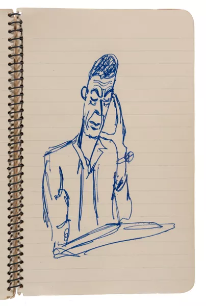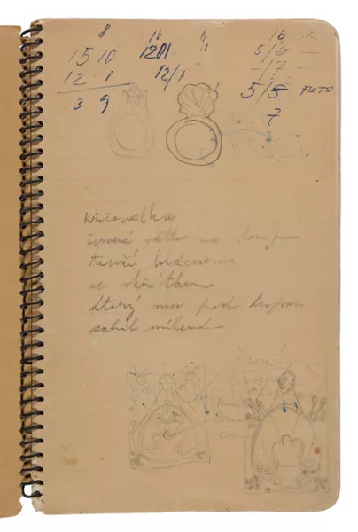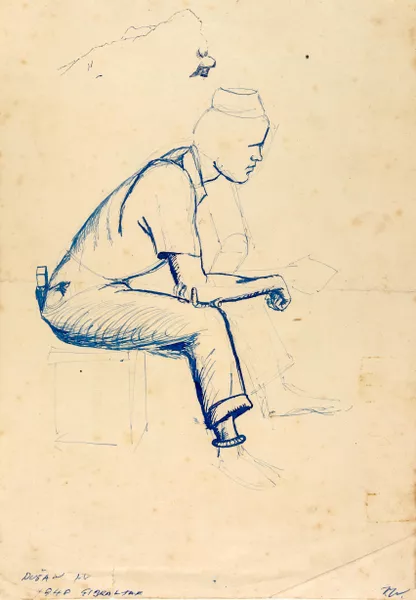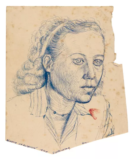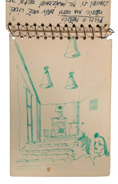 In March 1948, Dušan, Voitre and Vera reached the assembly point for those seeking political asylum in Allied Occupied Germany and were taken to the Dillenburg displaced persons’ camp where they remained until July. Birth of Love and The Voyage by Dušan were created during his time in the camp and were painted on wooden slats that were removed from the base of their beds. These works survived, as did a series of drawings in a sketchbook by Voitre. These portraits captured the people he encountered in the camp and were accompanied by fragments of text in Czech.