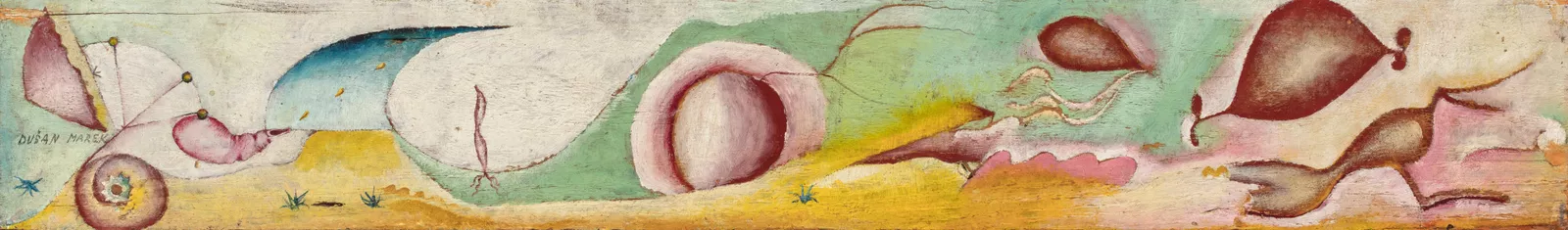Dušan Marek, born Bítouchov, Czechoslovakia 7 March 1926, died Adelaide 9 March 1993, The Voyage, 1948, Dillenburg, Hesse, Germany, oil on wood panel, 10.7 x 71.5 cm, 12.0 x 72.9 x 3.2 cm (including frame); Gift of the artist 1988, Art Gallery of South Australia, Adelaide, © Art Gallery of South Australia.