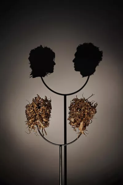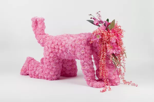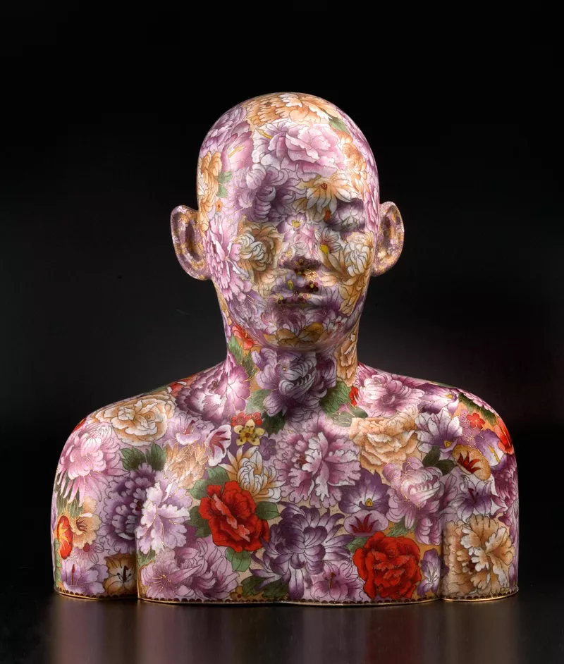 The bust is decorated in a traditional design known as ten thousand flowers, with the flamboyant peony taking centre stage, it expresses good wishes, as well as longevity. Peonies have long been appreciated in China as the ‘king of flowers’ and are generally known as symbols of wealth and nobility. While Human human – cloisonné bust 3 uses the style and technique of Imperial China, the realism of the portrait creates an incongruity in the pairing of a contemporary human form with a traditional surface design. Despite the beauty and opulence of the decoration, the work exudes an unease: with its closed eyes and expressionless visage, this sculpture feels more like posthumous portrait, a death mask. The extensive floral decoration is slightly cloying, an attempt to camouflage the truth by diverting the viewer with its beauty.