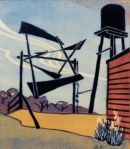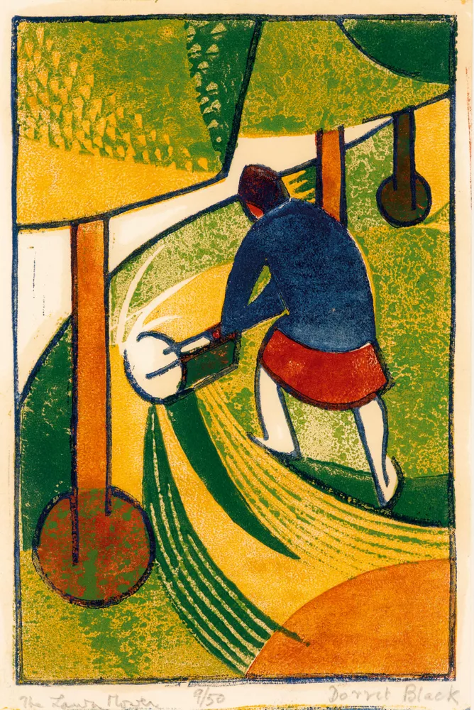 As lino-cutting does not allow for fine detail, the artist can work in a bold, simplified manner. Black’s prints are broadly but carefully composed. For her colour prints Black used a separate block for each colour, four for The lawn mower. Black often used oil paint instead of heavier printing inks, as they allowed her to achieve a range of tonal effects and textures in the finished prints.