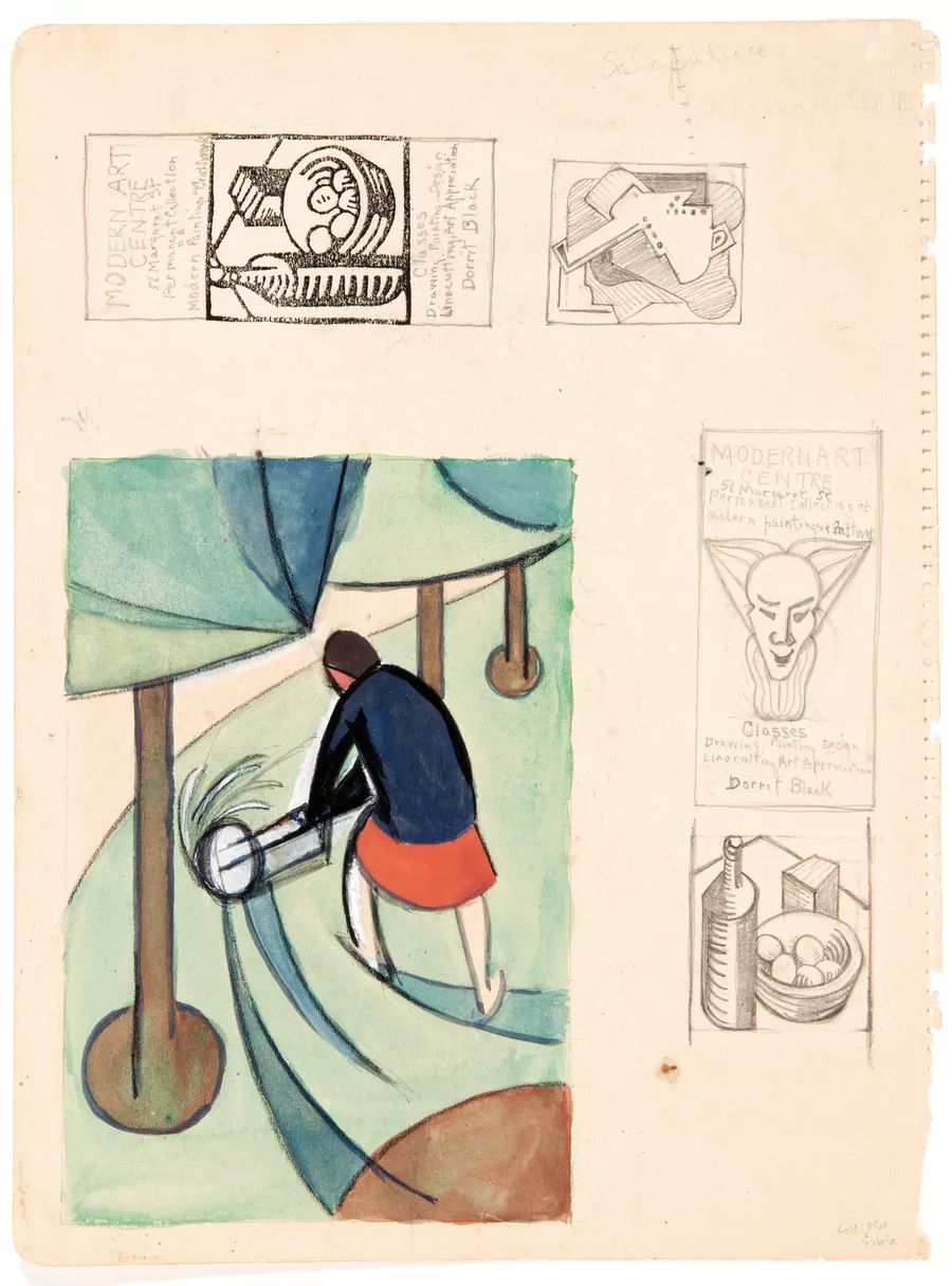 Dorrit Black, born Adelaide, South Australia 23 December 1891, died Adelaide, South Australia 1951, Study for linocut 'The lawn mower' and studies for Modern Art Centre advertisements, 1931-32, Sydney, gouache, pencil, linocut on paper, 27.5 x 21.2 cm (sheet), 19.7 x 13.0 cm (image); Gift of Ross Adler AC, Albert Bensimon, Catherine Boros, Ann Croser, Elizabeth Finnegan OAM, Anne Hetzel, Skye McGregor, David McKee, Janice Pleydell and Graham Prior through the Art Gallery of South Australia Foundation Collectors Club 2011, Art Gallery of South Australia, Adelaide.