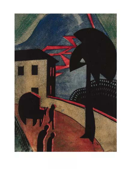 Black painted multiple landscapes at the summer school. For Mirmande, 1928, she stood at her easel closer to the village and further to the right of the belfry and zoomed in on the scene. Her version is spatially the shallowest and the most radically reductive of the three. With its strongly delineated, simplified ascending forms and tilted geometry, it is her greatest Mirmande triumph. The township is compressed into a floating parallelogram, which – perhaps because she was pleased with the motif – reappears in the hilltop linocut The castle, Taormina, c.1928–29.