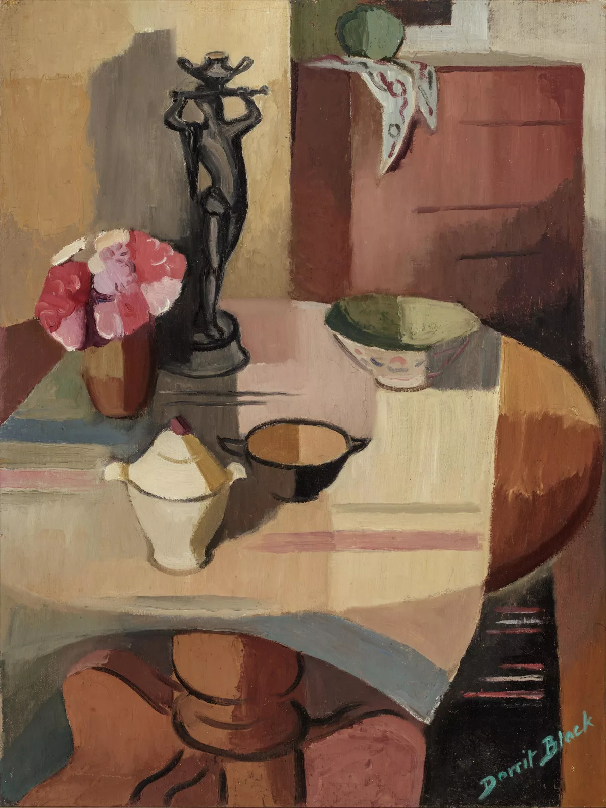 Throughout her career, Black refrained from depicting her own image, but still life painting provided a realm in which she could fuse her own identity with the modern. In Still life – interior the hallmark, personalised decorative touches of the scarf and fresh flowers could be regarded as evocative manifestations of the artist herself.