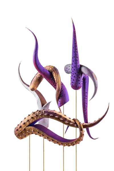 Robinson’s sculptures and installations reflect these interests in a material sense too. She frequently borrows from European historical costuming and Elizabethan-era sewing and pattern-making techniques to create her sculptures. The results are highly detailed, fastidious and labour-intensive installations that combine elements from ceremonial costumes with references to animals and plants or abstracted forms that allude to the human body.