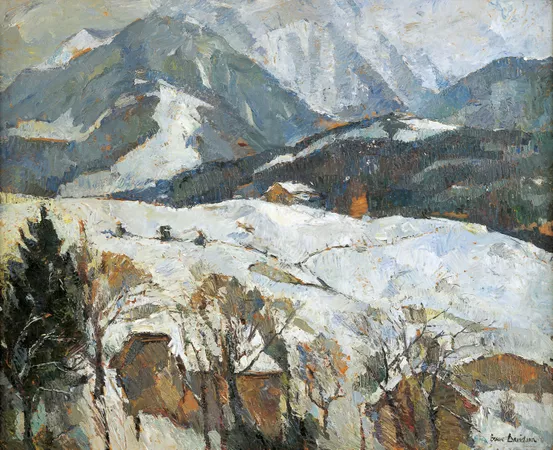 The scene of Guéthary, a small French coastal town near the border of Spain, is animated through a controlled range of neutral tones, laid flat against areas of vibrant colour. The carefully arranged composition, with an underlying geometric structure, suggests the influence of Paul Cézanne, an artist greatly admired by her. However, the bold and dynamic paint application is distinctively the artist’s own.