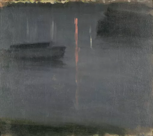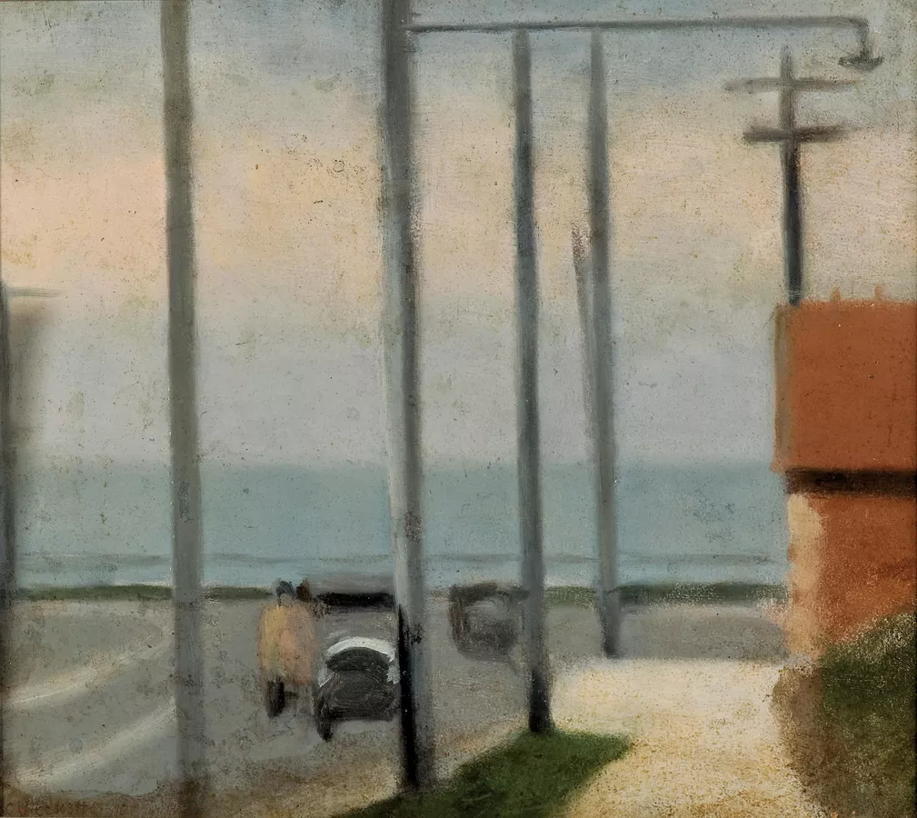 A feature of many of Beckett’s compositions is the use of extreme horizontal and vertical lines. She regularly broke the rules of composition by placing a strong vertical in the centre of her images, as is evident in The last flush, c. 1928. As curator Tracey Lock describes ‘here she counterbalances the scene with a shadowy form on the left; filled with reminders of twilight, the dominant vertical seems to connect the physical world to a timeless higher reality’. Beckett reverses this approach in Wet night, Brighton, 1930, where the centre is a void of air above the suggestion of a road leading into the limitless sea. This flooded scene is framed by four posts, which optically work as two vertical bands running across from top to bottom of the picture plane.