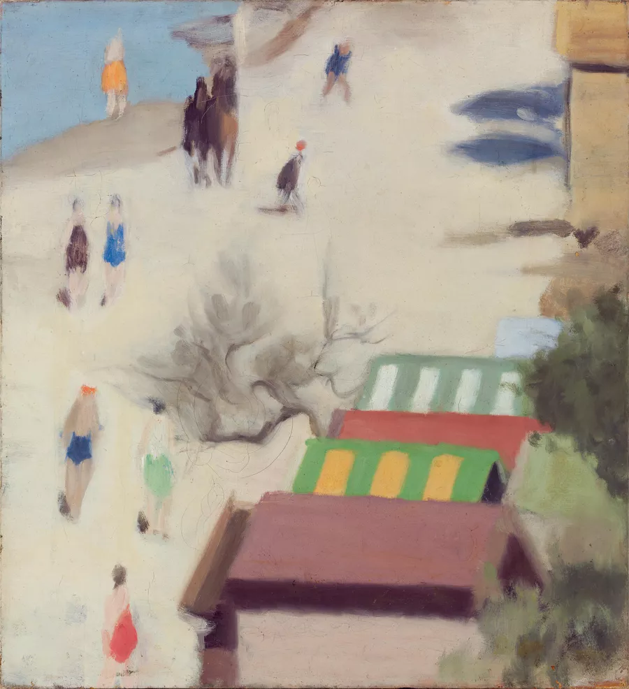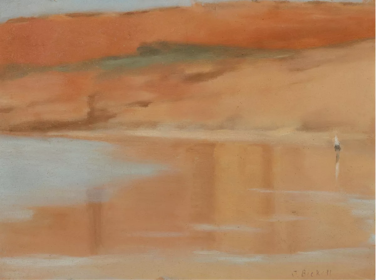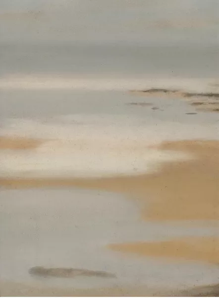 Beckett made use of refracted light to convey the phenomena of nature in terms of light and colour. In Wet sand, Anglesea, 1929, and Tranquility, 1933, her glimmering and shimmering painted effects take the viewer to the edge of spatial orientation. The sun is gone, yet strips of beach and the ochre cliffs dissolve into a unified shifting field of luminous, fluid colour. Here, Beckett edges the rendering of nature almost into cosmic abstraction.