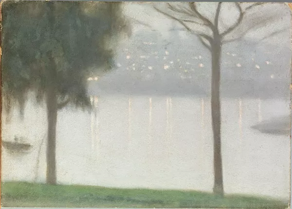 Clarice Beckett, born Casterton, Victoria 21 March 1887, died Sandringham, Victoria 7 July 1935, Evening, St Kilda Road, c.1930, Melbourne, oil on board, 33.8 x 39.5 cm (sight); Purchased with funds provided by the Australian Collection Benefactors' Program 2013 Art Gallery of New South Wales, Sydney, photo: Felicity Jenkins.