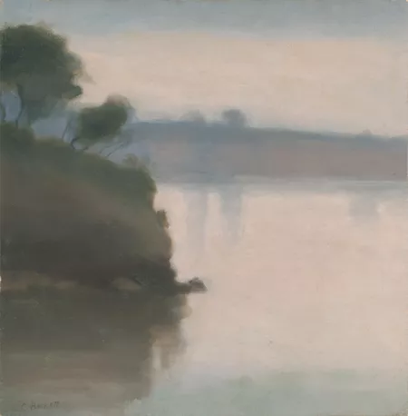 Beckett uses filtered light as a way to dissolve overall form rather than to build up individual elements within the composition. Her use of diffused light creates a close tonal range, which dissolves the boundaries between the areas of light and shade and, thereby, cliff, tree and water. The soft melting edges of her forms are barely perceptible, and planes appear to shift from one into the other to create an extraordinary breath-like dreamy harmony, as Max Meldrum famously stated ‘there are no lines in nature’.